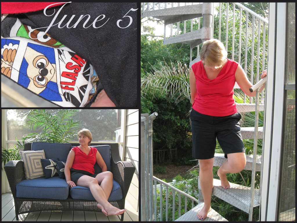 We're at the beach, people, so I did wake up in me made jammies, but the jury is still out on whether or not you'll see those babies in action. Most of the daylight hours were spent in a swimsuit that I did not make. Right now, a swimsuit is kind of on my "I never plan to make one" list, but never say never. However, we're kind of a eat breakfast and lunch at the house kind of family, and then go out for dinner. This was my outfit, post-cleanup, on the main floor porch. The spiral staircase leads from the pool area all the way to the roof, and is only a little scary.